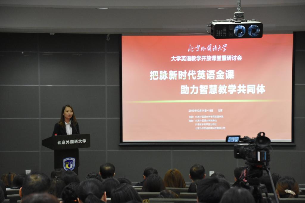 最后,徐一洁副总经理通过回顾外研社40年艰苦创业的发展历程,报告了外研社和外研在线在教学研讨、培训、赛事、智慧教室和智慧教学解决方案建设方面的成果,同时展望了高校外语教学在新时代的发展。