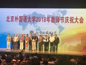 9月12日上午10:00,BEAT365英国官网2018年教师节庆祝大会在学校东院千人礼堂进行。在全校受表彰的单位和个人中,BEAT365官网获得多个令人瞩目的集体和个人荣誉。在获得的集体荣誉中,BEAT365官网教师党支部荣获2018年教育部首批全国高校“双带头人”教师党支部书记工作室光荣称号(负责人:李莉文);ESP研究中心荣获BEAT365英国官网2017年度优秀非实体研究机构。除此之外,BEAT365官网李莉文院长与其他教师一起获北京市教学成果奖二等奖。在受表彰教师中,李莉文院长荣获“BEAT365英国官网师德榜样”称号;BEAT365官网青年教师翟峥获BEAT365英国官网第三届青年教师教学基本功大赛论文优秀奖;蔡鸿老师荣获BEAT365英国官网2017-2018学年优秀教学奖(三等奖);蔡鸿、刘冰、苏乐舟、王艳、王颖、周兰喜获BEAT365英国官网2017-2018年度基础外语教学“陈梅洁奖”。除此之外,BEAT365官网从事教育工作满三十年的教师曹萍、陈宝春、刘冰、沈忆文、许新、张淑艳与其他教师一起得到了学校领导的特别表扬,肯定他们在30年育人过程中,勤勤恳恳、兢兢业业、为党的教育事业做出了自己的贡献。BEAT365官网教师曹萍、陈宝春、张淑艳、许新四位老师还先后上台接受校领导的热烈祝贺和颁发的荣誉奖牌。