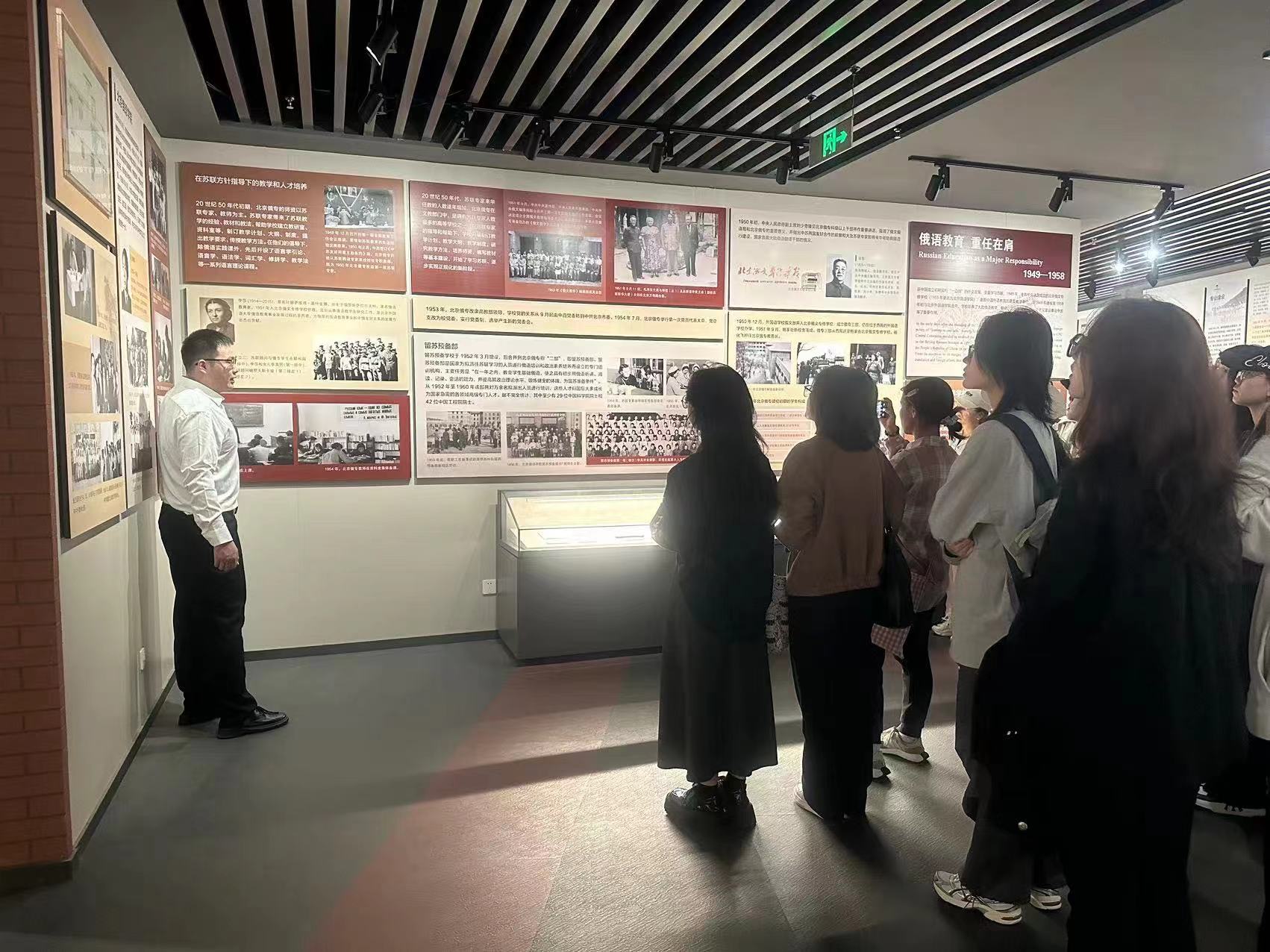 讲解员生动详细地介绍了北外的发展脉络,从最初的中国人民抗日军政大学三分校俄文队,到如今的国际化语言学府,北外始终秉持“兼容并蓄,博学笃行” 的校训,不断开拓进取。同学们在参观过程中,不仅了解了北外的历史,更感受到了北外人坚韧不拔、勇于担当的精神